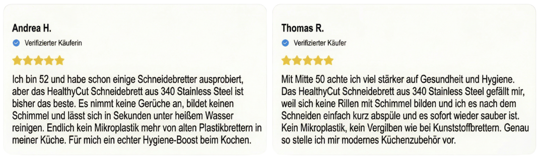 Ja, weil es genau dort ansetzt, wo herkömmliche Schneidebretter Probleme machen. Durch das hochwertige 304 Edelstahl entsteht kein Abrieb beim Schneiden – im Gegensatz zu Plastik- oder Holzbrettern gelangen so keine Mikroplastikpartikel oder Materialreste ins Essen.